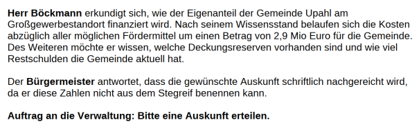 - BM: Auftrag an die Verwaltung: Bitte den Zweckverband informieren, dort muss gemäht werden.